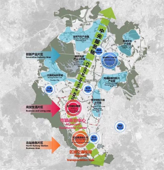 作为深圳地理几何中心和大湾区中轴C位,龙华占据“东进西协南联北拓中优”战略核心、港深莞中轴桥头堡的重要地位,天生自带主角光环。