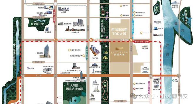 交通C位:双地铁上盖(8/10号线大主干道(北二环、景云路、北辰快速干道)+6条地铁线号线亩大明宫国家遗址公园、约8公里红旗线个城市口袋公园;