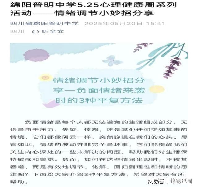 开云真人为深入践行《全面加强和改进新时代学生心理健康工作专项行动计划(2023—2025年)》部署和《绵阳市教育科学研究所关于开展第三届中小学师生心理健康教育活动周的指导意见》,我校秉持“全员心育 全程浸润”理念,构建“党委统筹-专业引领-家校协同”三维工作机制,成立以为组长,校长、分管副校长为副组长,各相关处室、心理教师、班主任为成员的心理健康周活动工作小组,由学生发展指导中心牵头,联合政教处、体卫艺、教科室、心理教师团队、班主任团队,围绕“心向阳光·润心赋能”主题,于2025年4月下旬至5月下旬开展心理健康周系列活动,覆盖心理知识普及、师生压力疏导、家校协同等度目标,形成“课程浸润-活动赋能-家校协同”育人闭环,通过开展丰富多彩活动,助力师生身心健康发展。